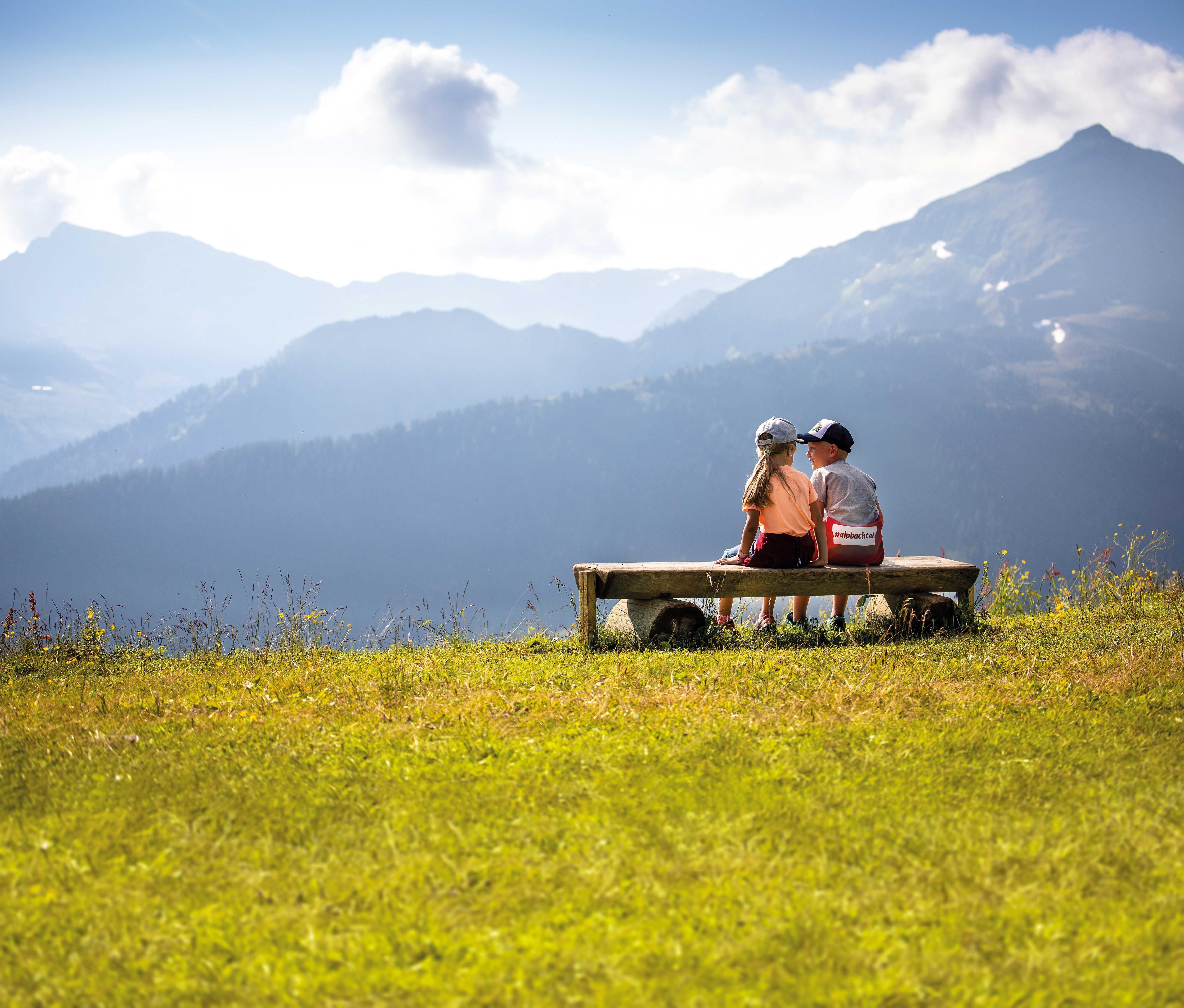 Blowing dandelions - family on a bench at the Panorama Trail Wiedersbergerhorn, Alpbach