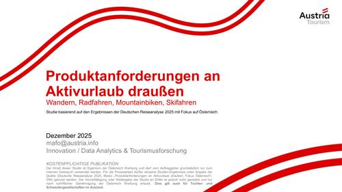 Die Studie mit Fokus auf Österreich-Planende basiert auf dem Modul „Produktanforderungen an Aktivurlaub draußen“ der Deutschen Reiseanalyse 2025. Eine Kurzinfo steht der österreichischen Tourismusbranche kostenfrei zur Verfügung. WiPool-Nutzer:innen können die Gesamtstudie herunterladen.