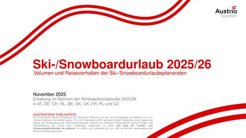 Basierend auf den Daten der Winterpotenzialstudie 2025/26 stellt dieser Bericht die Ski-/Snowboardurlauber:innen in den Fokus. Wie und wo wollen sie ihren Urlaub verbringen und wie preissensibel präsentieren sich diese? Die Studie wurde in Österreich, Deutschland, der Schweiz, den Niederlanden, Belgien, Dänemark, Großbritannien, Frankreich, Polen und Tschechien repräsentativ für die Bevölkerung im Alter von 18 bis 75 Jahren durchgeführt.